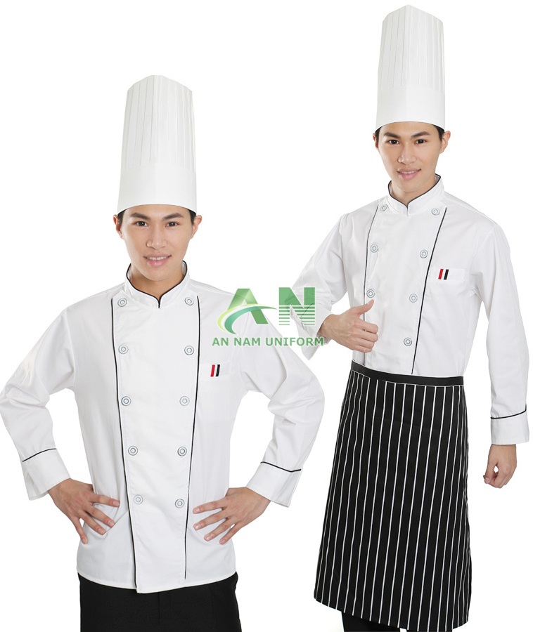 - Hình thức: bộ đồng phục bếp, phối áo, phối viền, nhiều mẫu.
