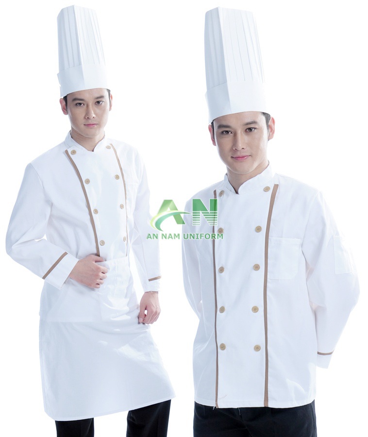- Hình thức: bộ đồng phục bếp, phối áo, phối viền, nhiều mẫu.