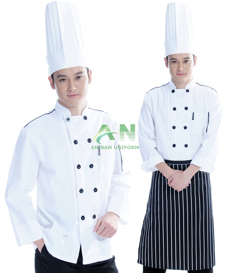 - Hình thức: bộ đồng phục bếp, phối áo, phối viền, nhiều mẫu.