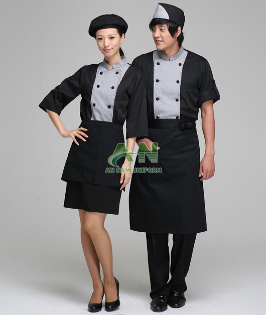 - Hình thức: bộ đồng phục bếp, phối áo, phối viền, nhiều mẫu.