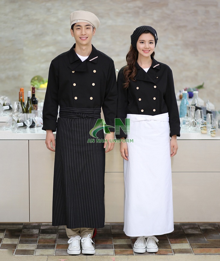 - Hình thức: bộ đồng phục bếp, phối áo, phối viền, nhiều mẫu.